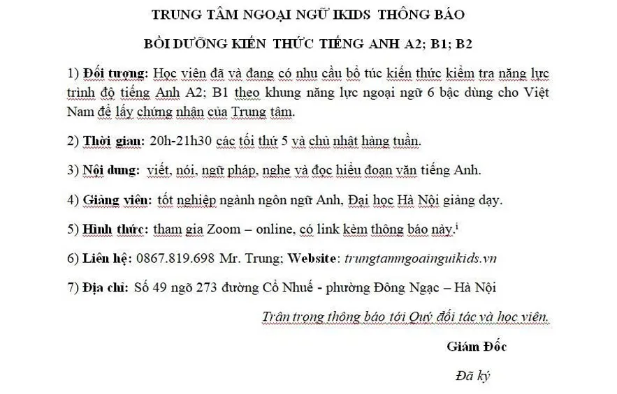 TRUNG TÂM NGOẠI NGỮ IKIDS THÔNG BÁO